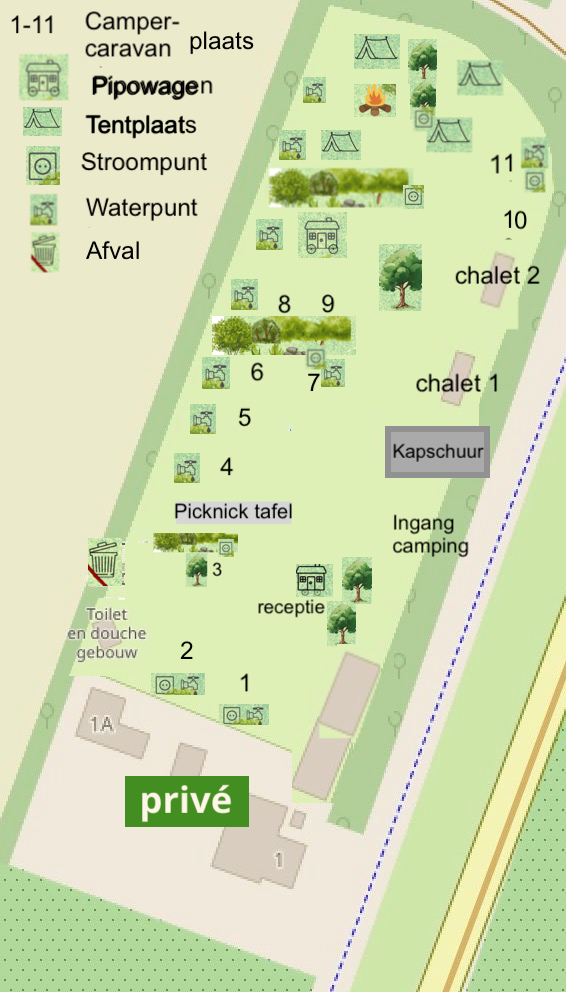 Bekijk de plattegrond om te zien waar je het liefst wilt staan: dichtbij het toiletgebouw, met uitzicht op de ondergaande zon, of juist in de schaduw van de bomen! Langs de rand bij het weiland geniet je het meest van de ondergaande zon.